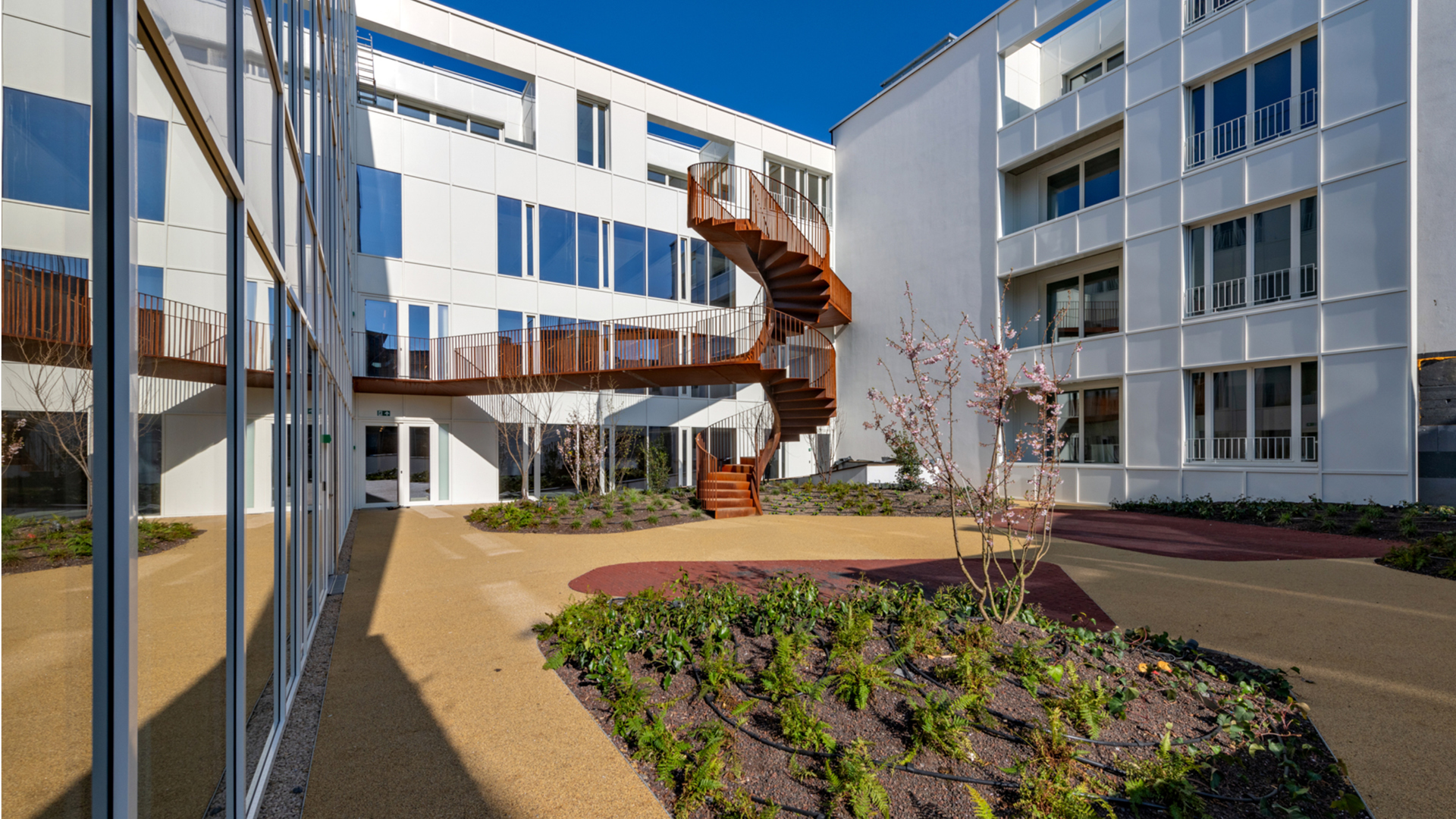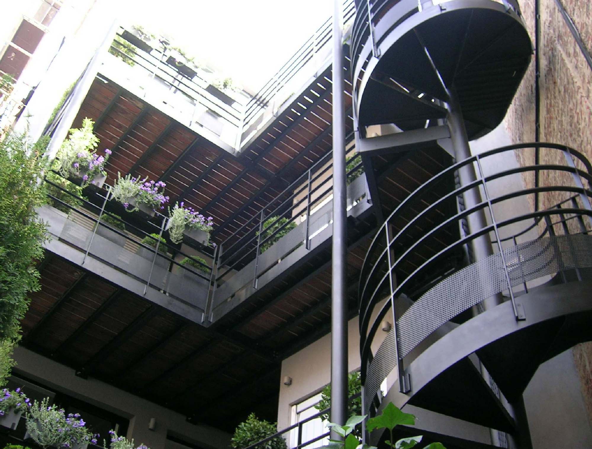 Wenteltrap in weervast staal bij bouwblok Madeleine