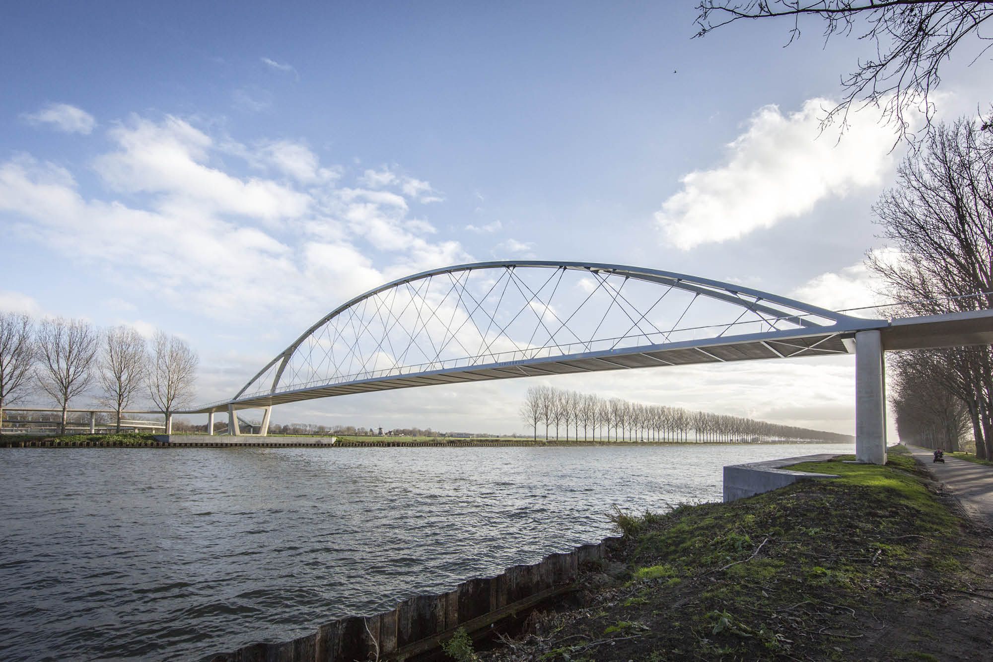 L’été de 2018 a vu la mise en service du pont en arc en acier le plus élancé des Pays-Bas à Nigtevecht. L’arc fourchu à treillis de 104 m de long pour cyclistes et piétons, enjambe le canal d’Amsterdam au Rhin avec une hauteur de passage sous tablier de 10 m. La hauteur de passage sous le pont exigée a fait de son implantation un véritable défi. En comptant les pentes et les passerelles d’approche, la longueur totale de l’ouvrage dépasse les 600 m. Grâce à une coopération précoce avec les résidents des environs et les parties prenantes, le processus s’est déroulé tout en souplesse.