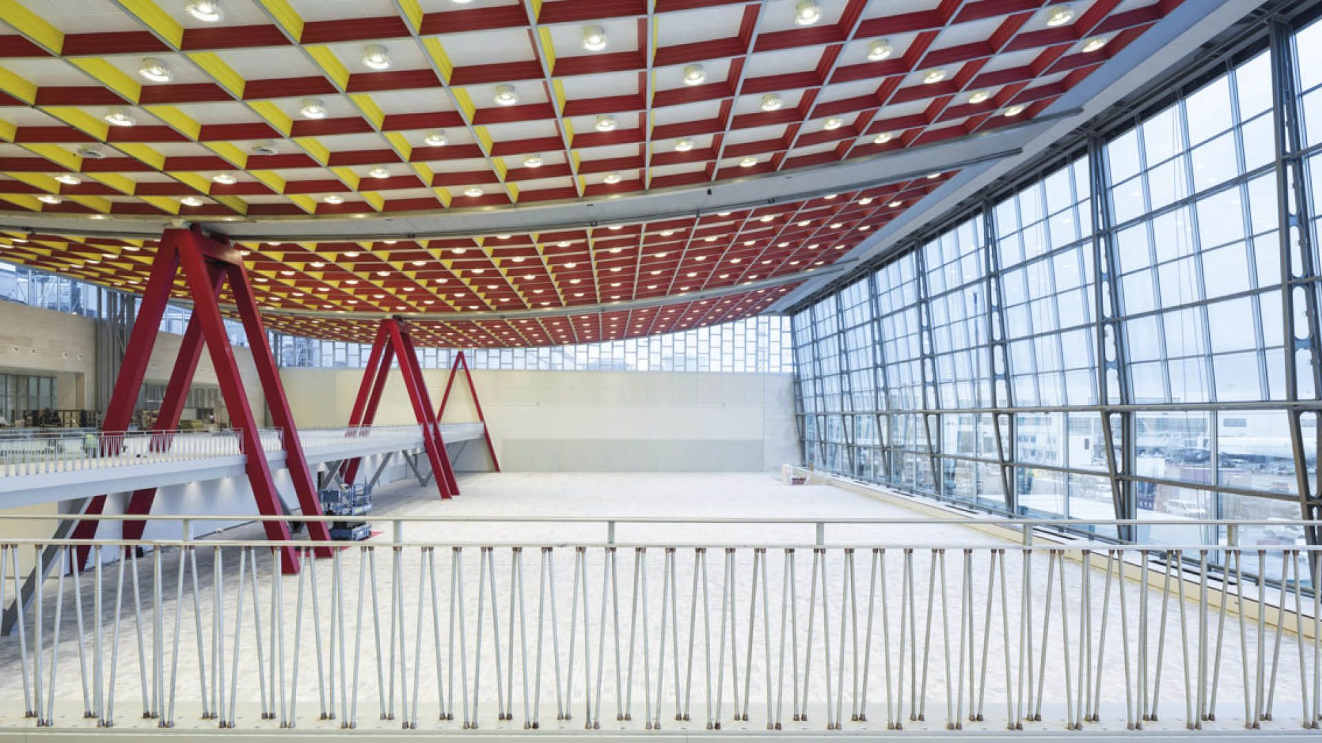 Pour donner une seconde vie au glorieux ‘Skyhall’, cette structure a été renforcée par le haut. Un treillis métallique avec le même porte-à-faux que la structure en aluminium d’origine a été intégré dans le toit existant, ce qui a permis de conserver le toit et le plafond existants. Les chevrons en forme de A ont été renforcés pour supporter la nouvelle structure de toit (521 tonnes d’acier S355) et soutenir également une passerelle sur des colonnes métalliques en forme de V, flanquant un escalier monumental. Trois tubes métalliques rectangulaires font office de limons, avec une portée horizontale de 13 m sans supports intermédiaires.