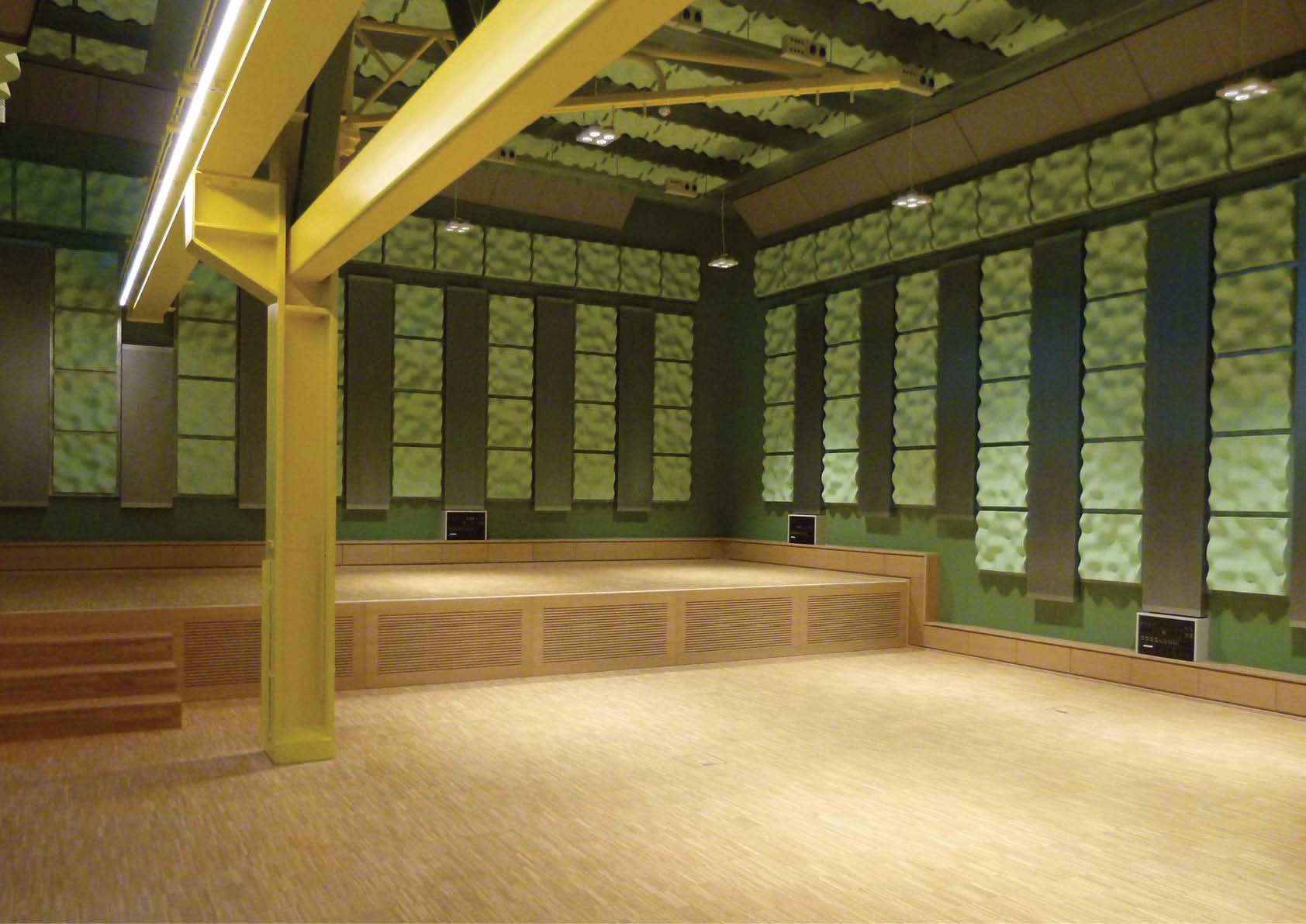Le projet se déploie sur deux niveaux rénovés de l’ancien hall industriel et regroupe, d’un côté, 2 studios d’enregistrement professionnels avec les espaces nécessaires à leur fonctionnement et, de l’autre côté, 9 salles de répétition accessibles au public. La rénovation comprend l’assainissement du bâtiment, la mise en œuvre de nouvelles fenêtres en acier inspirées des anciennes, de nouveaux murs et planchers ainsi que des aménagements intérieurs. L’identité du site a été conservée dans les espaces communs, là où l’acoustique n’a pas été traitée. La structure métallique existante a pu y être gardée visible. D’autres éléments industriels ont été conservés : ponts roulants, tuyauteries, volets roulant servant de coffrage perdu… etc. L’esthétique soignée des espaces « musicaux » contraste avec l’esthétique brute des espaces communs. Les parois y sont recouvertes de cassettes absorbantes métalliques spécialement conçues pour répondre aux exigences très spécifiques du projet.