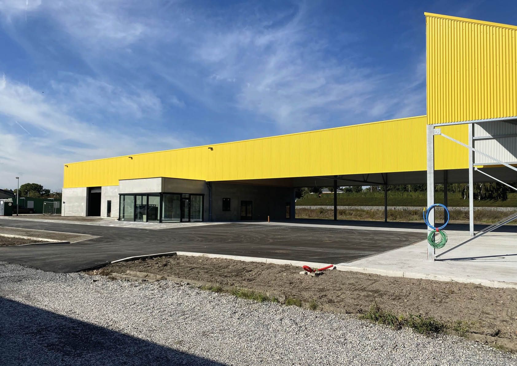 Le bâtiment se scinde en deux, avec le hangar d’un côté et l’auvent de l’autre. Au fond de l’abri, une "plinthe" en panneaux de béton forme un bel ensemble avec les blocs de béton pour le stockage du sel de voirie. Le volume supérieur du bâtiment s’étend comme un auvent au-dessus du parking où seront garées toutes les voitures de l’entreprise. Les tôles d’acier profilées procurent au bâtiment un aspect frais et contemporain. Les cadres de fenêtres et les portails en aluminium noir complètent le logo noir et jaune de Kapelle-op-den-Bos.