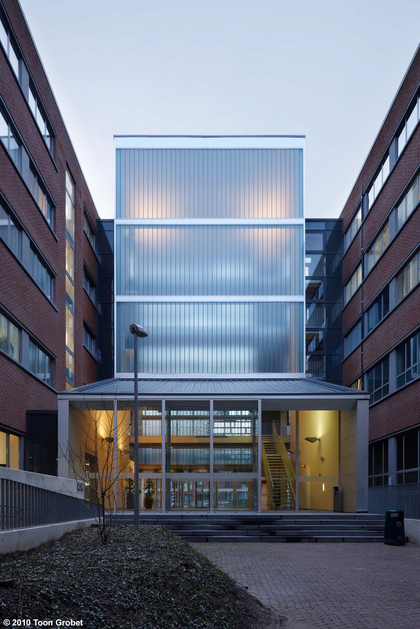 Les travaux concernent la construction d’un nouveau bâtiment d’accueil avec salle de conseil et espace de rencontre polyvalent. Ce projet est installé entre deux bâtiments existants de la Faculté des Sciences sociales. Le choix s’est porté sur l’acier, ce qui a permis une construction rapide de la toiture. Ce choix s’est aussi révélé avisé d’un point de vue budgétaire. La structure en pente du toit est constituée de profilés IPE sur lesquels un élément de toiture sandwich a été placé en tant que support pour la couverture à joint debout. La structure de la façade comporte des profilés HEB, HEM, UPN et des profilés creux, tous galvanisés. Le revêtement en tôles d’acier galvanisées a été placé sur un profilé galvanisé en Z. Les boîtes intérieures ont été fixées à la structure. Du carton-plâtre, dont la structure porteuse a été placée entre les profilés, en parachève la partie intérieure. L’exécution de toutes les surfaces en un seul matériau produit un beau contraste avec les briques des façades existantes.