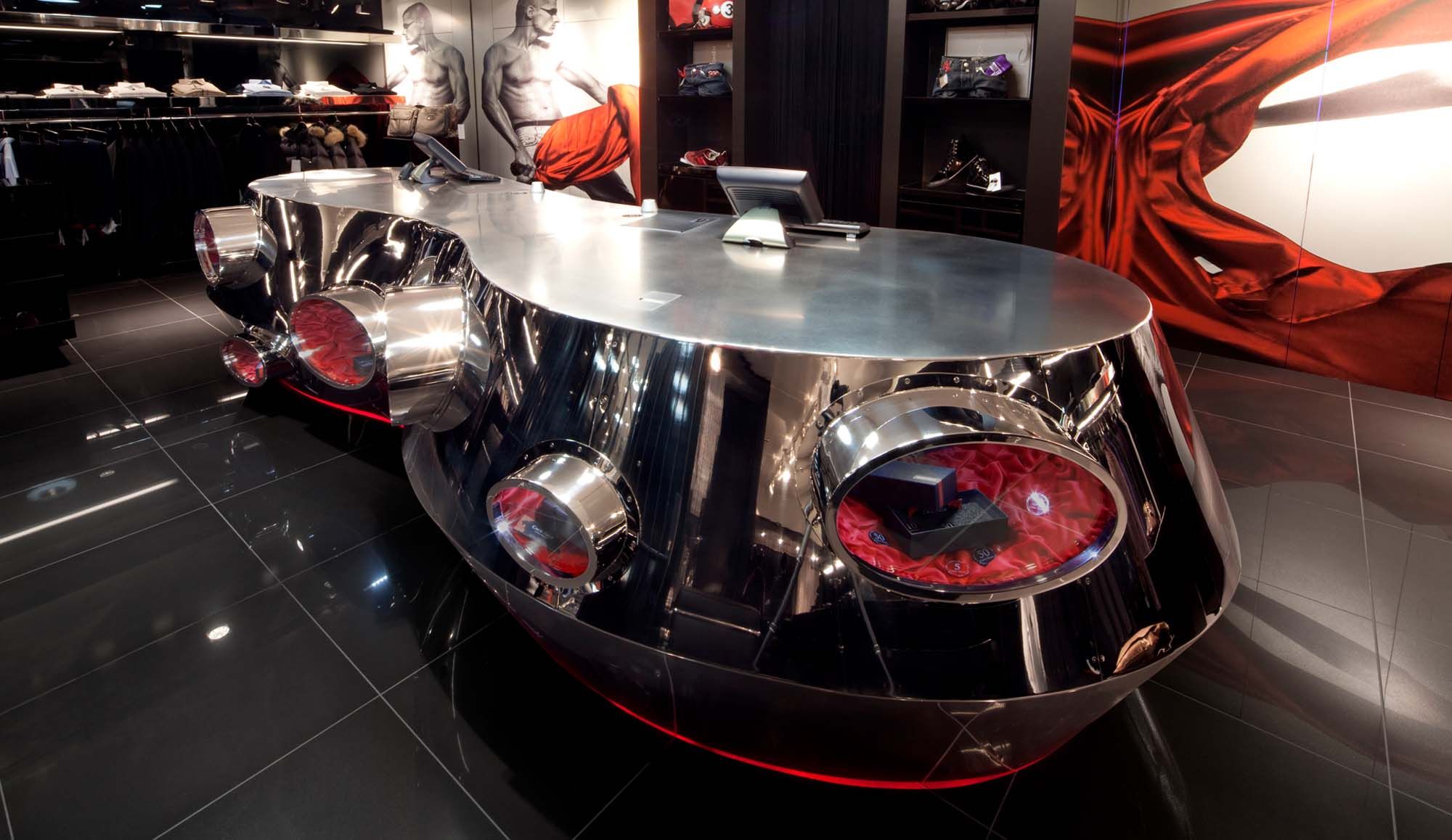 Pour Cavoe-Tagoe, laboratoire stylistique pour hommes et commerce spécialisé dans la mode, un cadre de référence élégant et intemporel devait être créé. Le concepteur a opté pour un langage formel organique qui affirme fortement sa présence dans l’espace grâce à l’utilisation de matériaux spécifiques - acier inoxydable brillant poli par électrolyse associé à des plans de travail en acier inoxydable brossé. Le volume brillant est équipé de nombreuses fonctions techniques. Le colosse brillant et étincelant en acier inoxydable, long de 6 m et pesant une demi-tonne, a revendiqué sa place dans le magasin, mais de manière modeste, comme l’affirmation d’une puissance masculine retenue. Le choix de l’acier allait de soi : il offre la possibilité d’obtenir une grande rigidité avec une épaisseur particulièrement réduite. En outre, il autorise différentes formes et difformités.