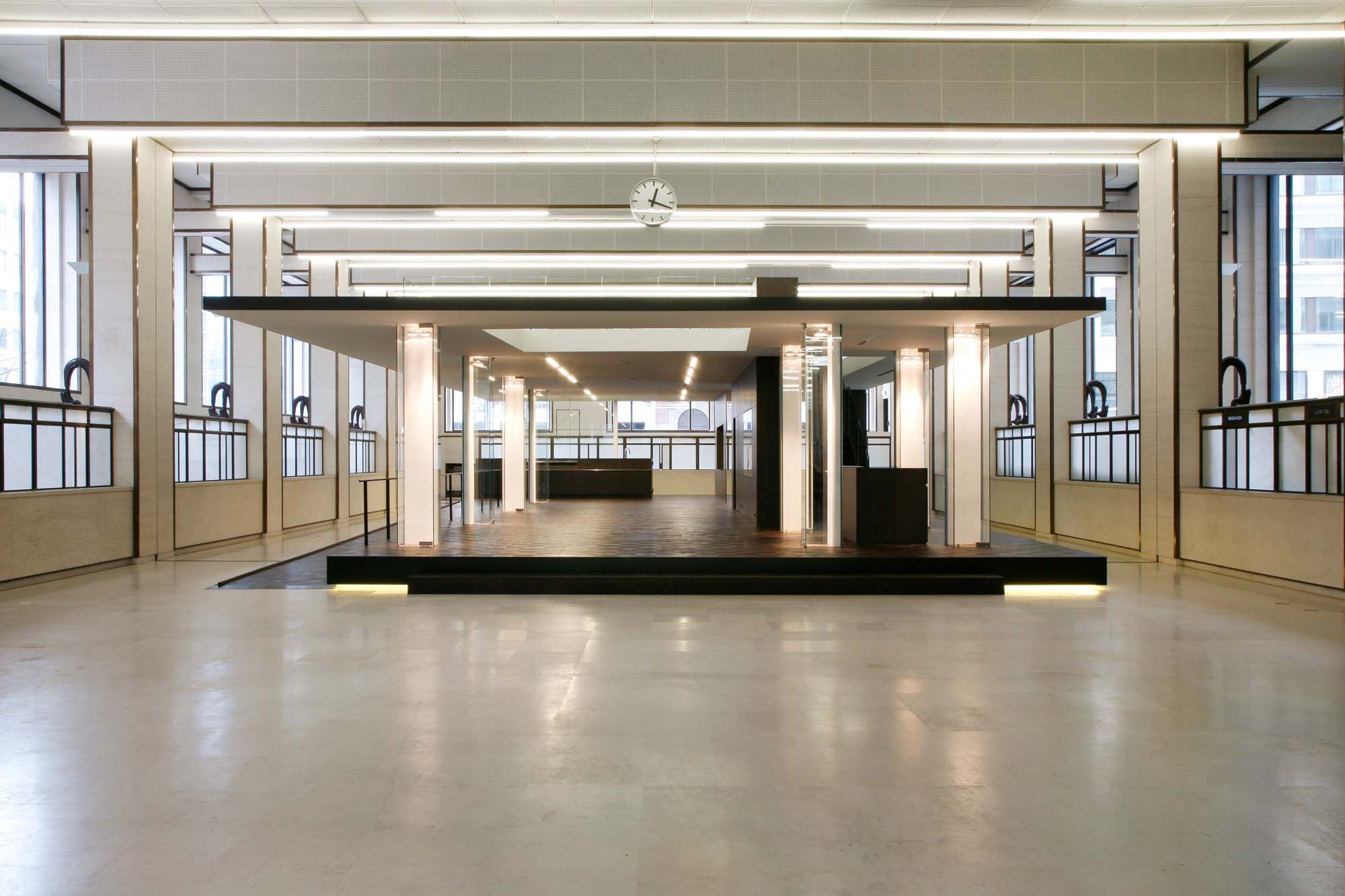 Le but du projet était de transformer la salle des guichets - partie de l’ancien bâtiment des chèques postaux à Bruxelles - en place du marché couvert. Ce lieu de rencontre accueille différentes fonctions: coin de lecture et d’information, magasin, brasserie, espace d’exposition, espace pour conférences, débats et événements culturels.