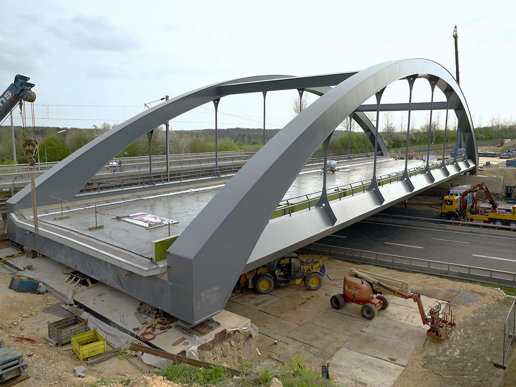 L’Administration des Ponts & Chaussées demande la réalisation d’ un ouvrage permettant d’augmenter le gabarit de 4,50 a 5,50 m, de permettre l’élargissement de l’autoroute A6 de 2 a 3 bandes et de limiter les perturbations du trafic autoroutier au minimum. Cela impose un ouvrage à travée unique, c’est-a-dire un tablier qui enjambe la totalité de l’autoroute sans reposer sur des appuis intermédiaires de façon à garantir une liberté totale a la conception de l’A6 et a son évolution future. Le ‘bow-string’ ou ‘tied arch bridge’ est un ouvrage à tablier intérieur constituant le tirant de deux arcs auxquels il est suspendu à l’aide de suspentes en câbles d’acier. L’on donne généralement à l’arc la forme d’une parabole du second degré ce qui correspondant au polygone funiculaire d’une charge uniformément répartie. Pour obtenir une raideur flexionnelle satisfaisante au système soumis à de fortes charges mobiles, la solidarisation tablier-tirant est totale. Le tablier a une rigidité plus importante que celle des arcs afin de mieux faire face aux sollicitations dynamiques.
