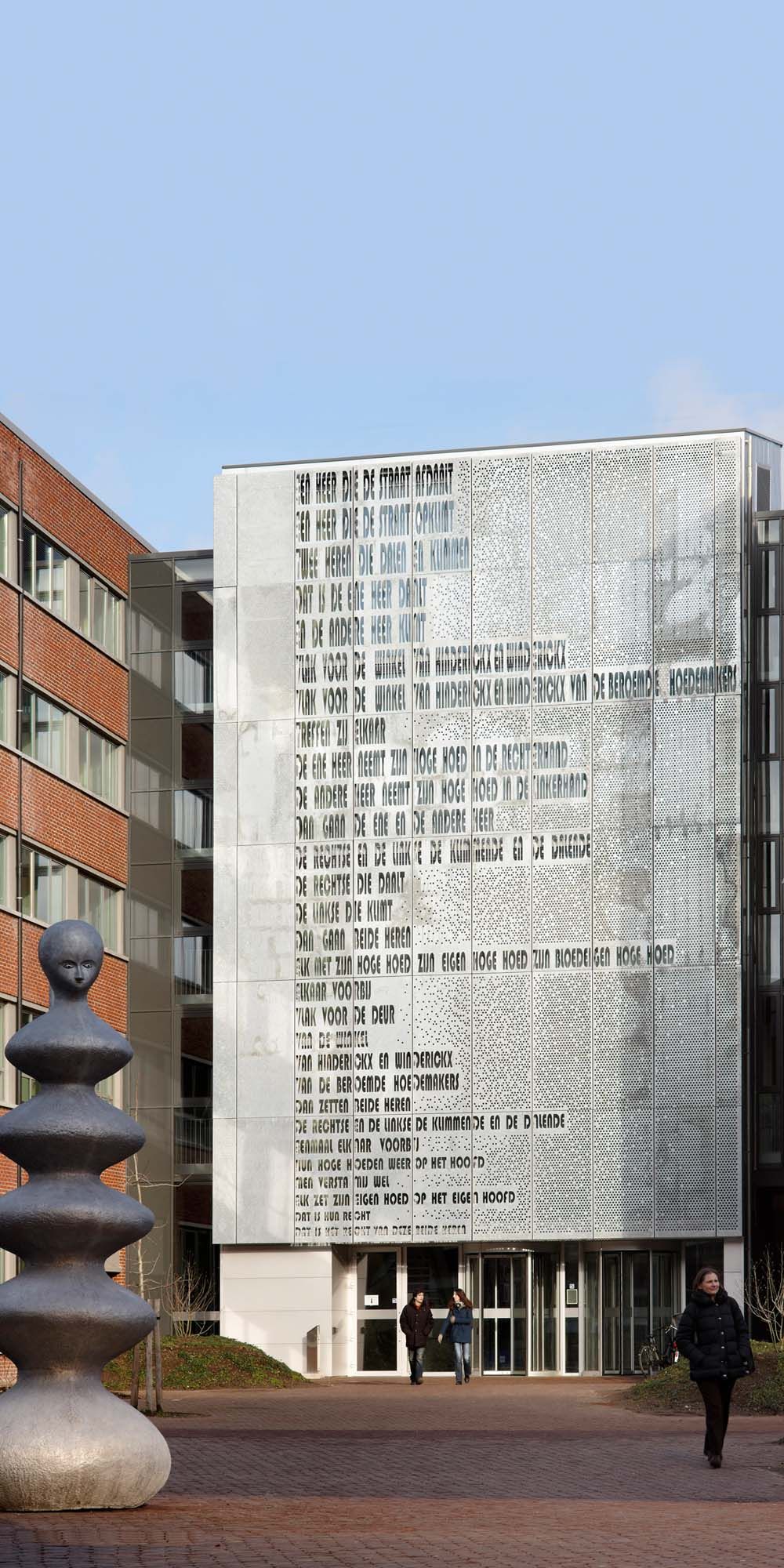 La façade en verre, orientée au sud, de l’accès entre deux bâtiments existants de la faculté louvaniste des Sciences sociales doit être équipée d’une protection solaire. Afin de transcender la simple fonctionnalité, il a été décidé d’y associer une œuvre d’art. La volonté de limiter le porte-à-faux et le poids du pare-soleil a entraîné le choix de l’acier.