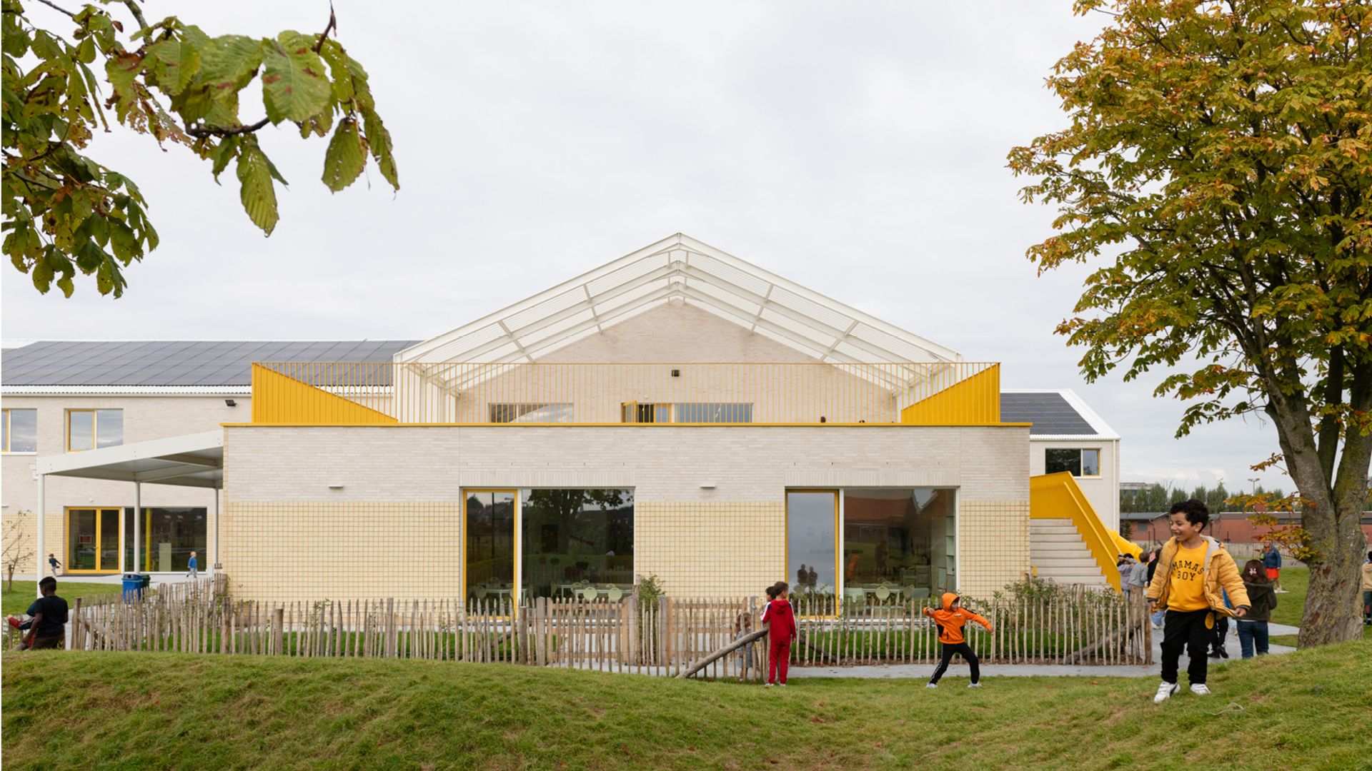 Le nouveau bâtiment de l'école Nest est le résultat de la fusion des deux écoles 'Pieter' et 'Wijzer' sur un site situé à côté de l'hippodrome de Kuurne près de Courtrai. Le plan du bâtiment est en forme de croix, minimisant la recherche des limites du terrain, mais créant également 4 espaces extérieurs distincts et créant des zones à l'intérieur du bâtiment qui se connectent à ces espaces extérieurs.