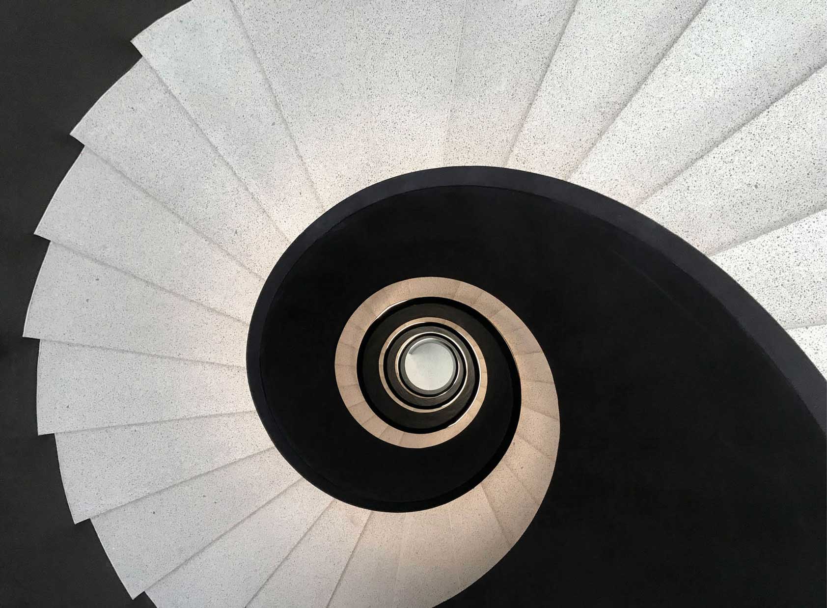 In een nieuw kantoorgebouw van vijf verdiepingen in Luxemburg-Kirchberg pronkt een sculpturale trap met een vloeiende spiraalvorm, in een zachte donkere kleur, met lichte terrazzotreden en verlicht door een verticaal geplaatste ronde koepel. De leuning van deze wenteltrap, die tevens dienstdoet als noodtrap, bestaat integraal uit staal. De treden zijn ter plaatse gerealiseerd in gewapend beton. Er werd een sjabloon getekend op flexibele houten platen, waarna de leuning in verschillende delen werd vervaardigd uit 15 mm dik plaatstaal en in het atelier op maat gebogen werd. Vervolgens is ze naar de werf getransporteerd en onzichtbaar tegen de betonnen treden bevestigd. Tot slot zijn de afzonderlijke delen ter plaatse gemonteerd, geschuurd en gelakt (RAL 8022). De algemene en indirecte verlichting van de trap, die ook fungeert als noodverlichting, wordt verzorgd door een ledstrook die geïntegreerd is in de leuning met een diameter van 20 mm.