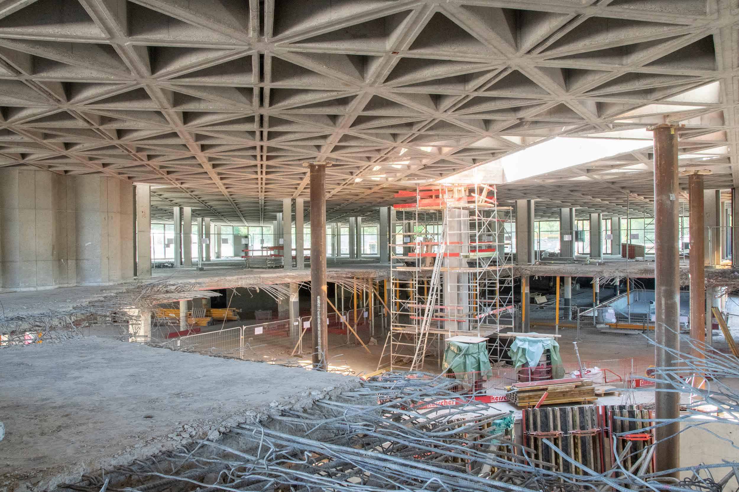 Le nouveau propriétaire souhaitait accueillir différents utilisateurs dans le bâtiment. L’ensemble a été réaménagé avec une salle de conférence, des bureaux, des espaces de travail, un hôtel, un centre de bien-être et un restaurant. Dans la mesure du possible, les matériaux seront réutilisés après la démolition. La façade extérieure en verre a été remplacée par un vitrage d’aspect presque identique, mais dont les performances thermiques sont conformes aux normes contemporaines.