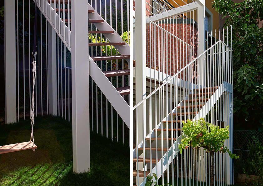 Deze smeedijzeren verandastructuur heeft de allure van een klein tuinpaviljoen. Het terras fungeert als een platform met twee niveaus. Beneden ontvouwt de ruimte zich tot een speelplek voor kinderen, inclusief een aan het gebouw bevestigde schommel, een ‘cottagesfeer’ en een raam dat uitzicht biedt op de tuin. De 1,5 ton zware structuur is geïnspireerd op het befaamde ‘Dom-Ino’-systeem van Le Corbusier en bestaat volledig uit S235-staal. Het gebruik van staal liet de ontwikkeling van een verfijnde, uitgepuurde structuur toe, waardoor er een slanke, rationele constructie ontstond. De prefabricage in het atelier zorgde ervoor dat het geheel snel en netjes gemonteerd kon worden op de werf. De verandastructuur heeft ook een uitzonderlijk lange levensduur dankzij de corrosiebestendige afwerking (verzinking en poedercoating).